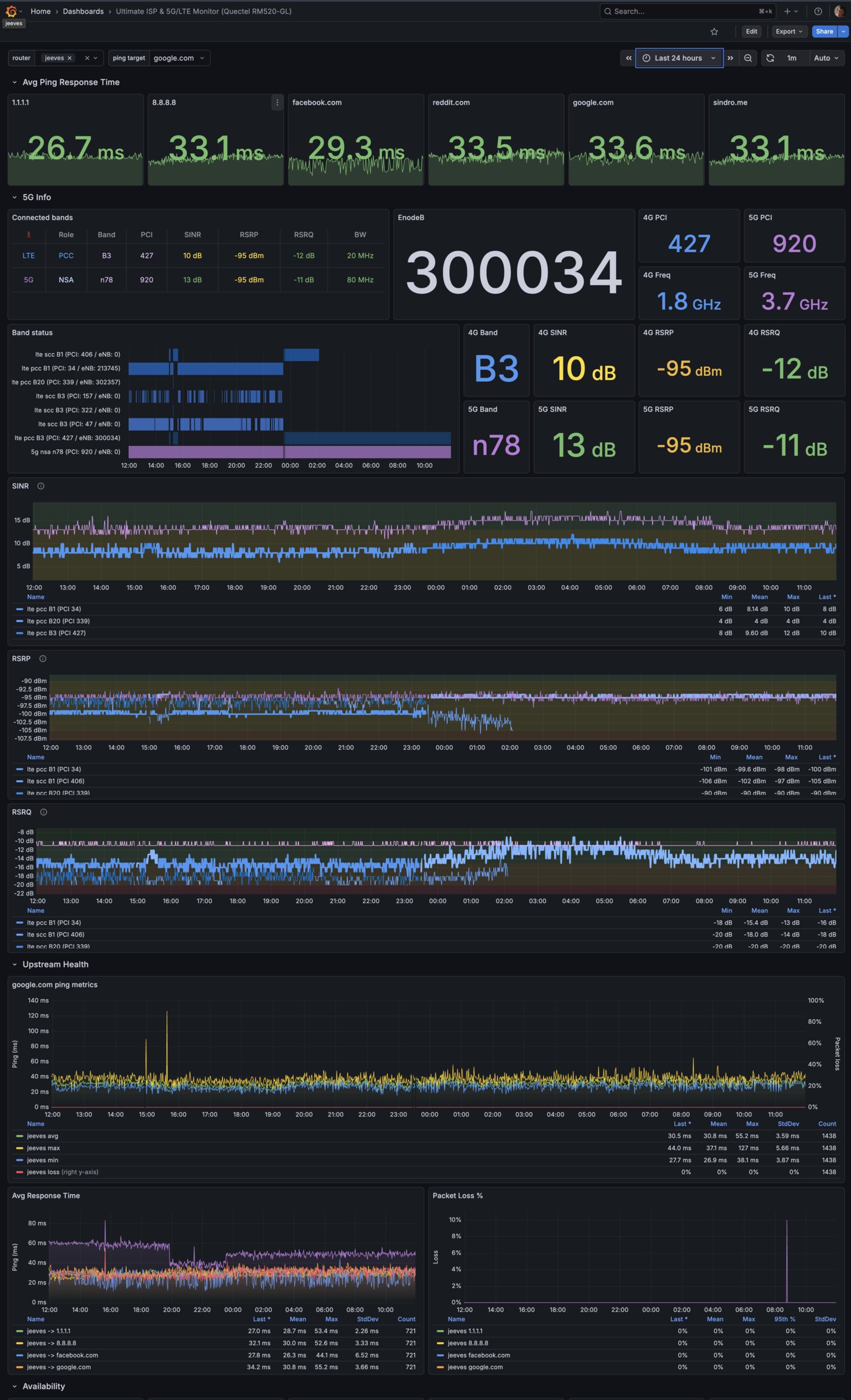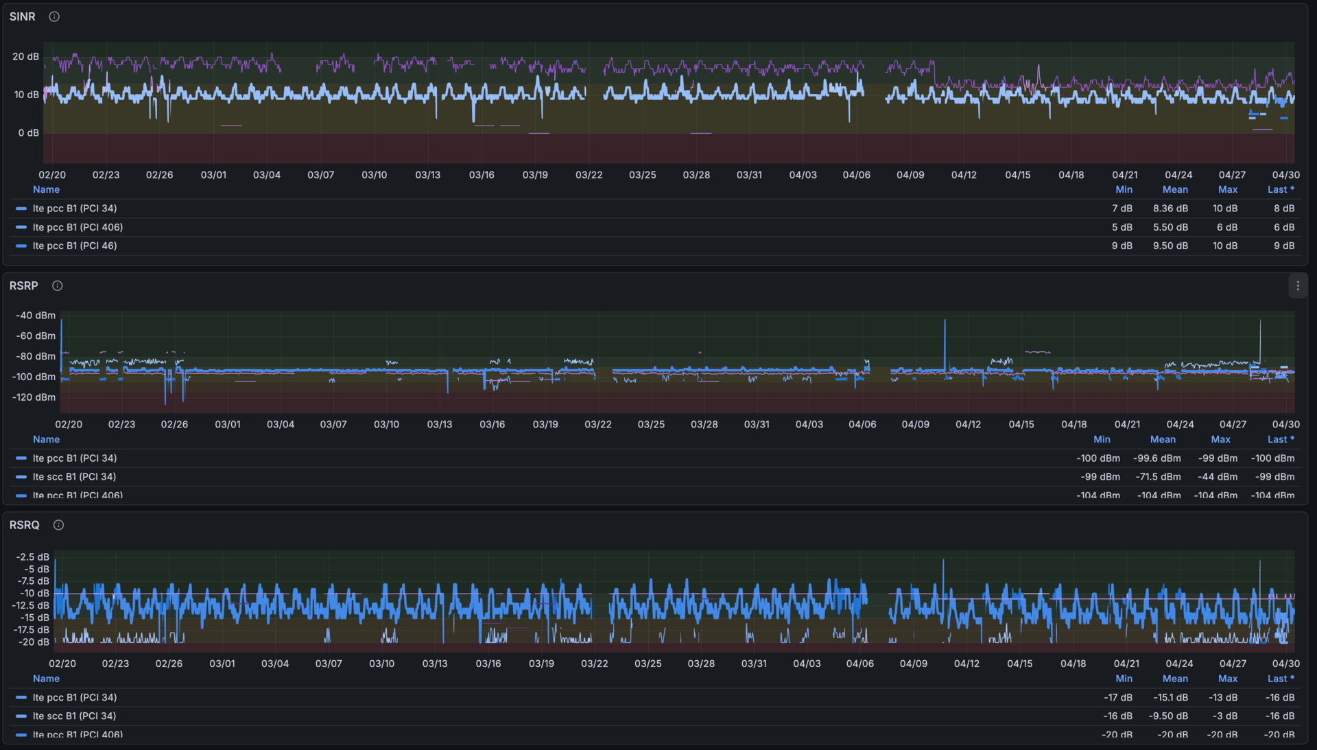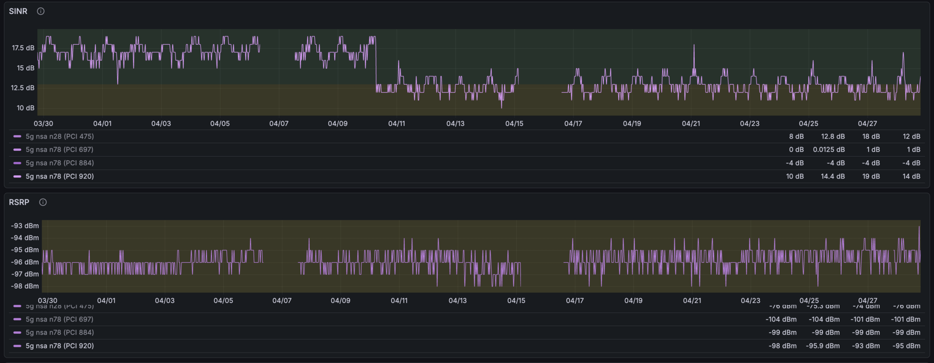Raccolgo RSRP, RSRQ, SINR, banda, PCI, e stato della carrier aggregation tramite quectel-5g-tools da gennaio, con destinazione una VictoriaMetrics interna. La telemetria ha reso inequivocabile che il drop di SINR era arrivato settimane prima che toccassi il firmware. Stesso segnale (RSRP piatto), 6 dB in più di rumore, stessa PCI, nessun handover. La migrazione non è la causa. Non sono tornato indietro allo stock — sicurezza dai dati, non dalle speranze.